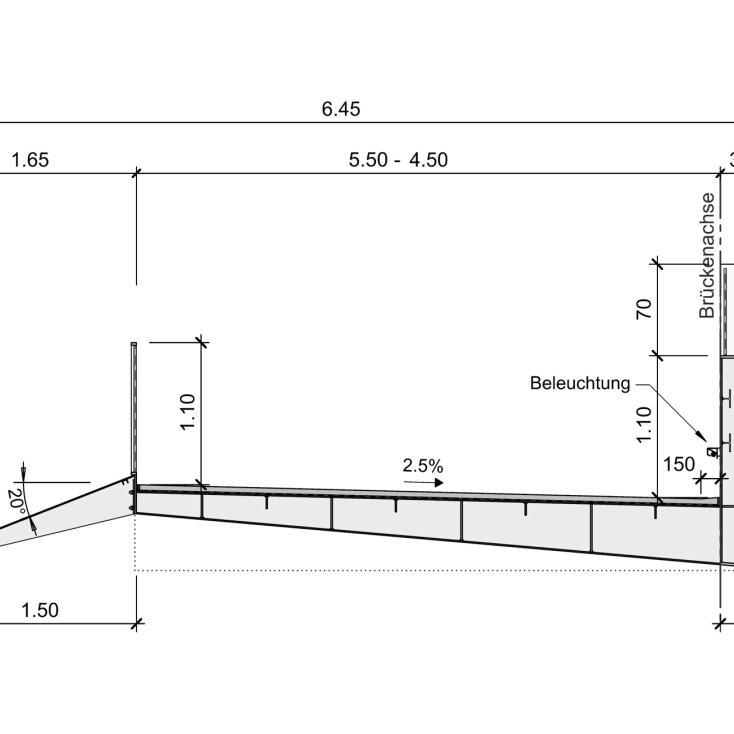 Die Passerelle wird als eine im Grundriss leicht gekrümmte, 6-feldrige Stahlbrücke konzipiert. Der Querschnitt ist asymmetrisch ausgebildet, um dem spezifischen Ort mit einer bewussten Vorder- und Rückseite begegnen zu können. Auf der einen Seite das offene Gleisfeld und auf der anderen Seite das Bahnhofareal.