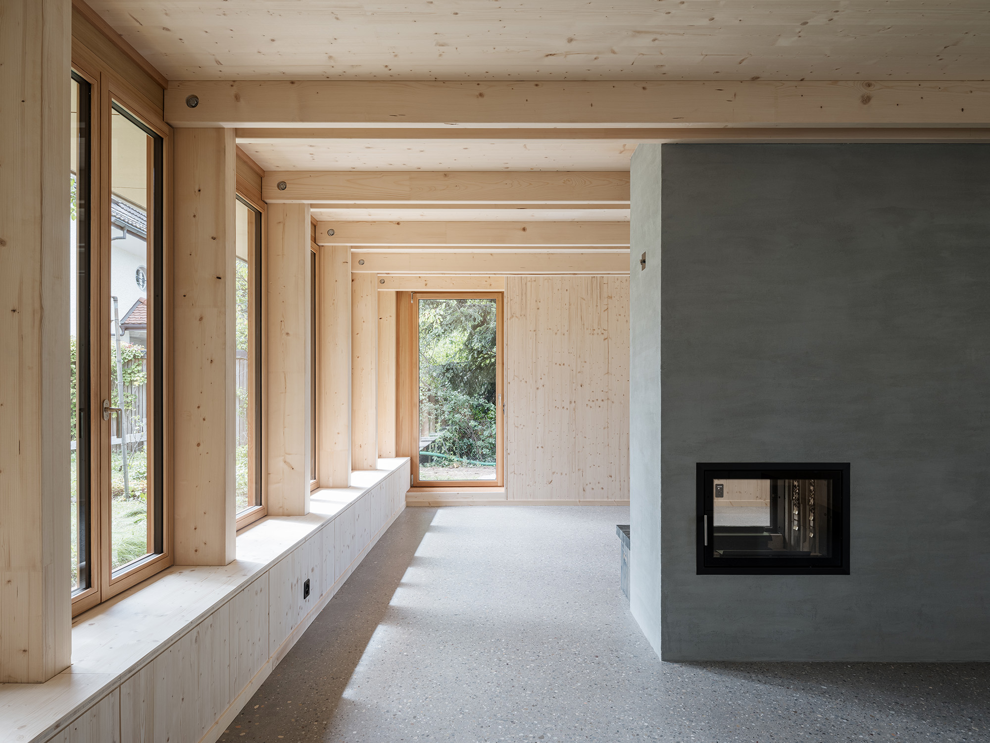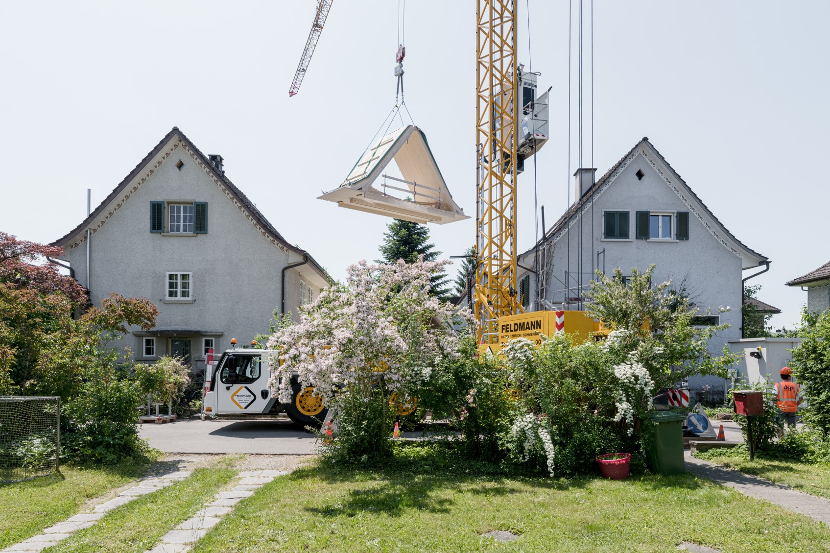 Die Holzstruktur des Dachraums wurde in sechs Modulen vorgefertigt. Diese konnten dank einer durchdachten Fügung direkt auf die Fassadenpfosten im Erdgeschoss abgesetzt werden, wo am Gelenkpunkt eine sichtbare Bauschraubenverbindung die Bauteile verbindet.
