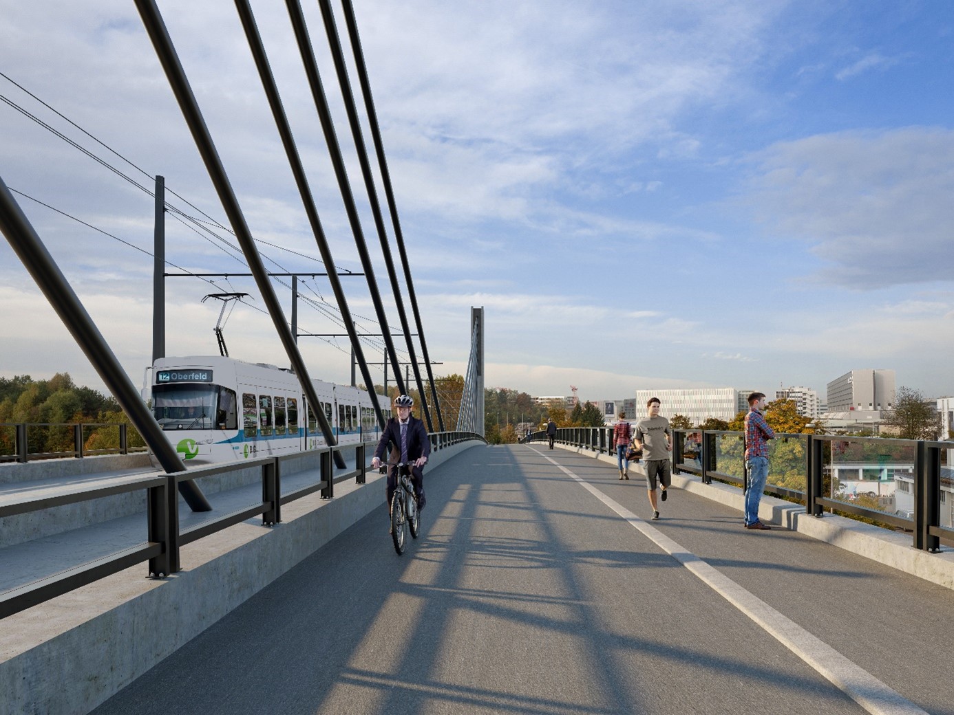 Als INGE AIR freuen wir uns, als Gesamtplaner mit der Projektierung des Los 1 einen wesentlichen Teil zu diesem Grossprojekt leisten zu dürfen. Das Los 1 umfasst die Strecke zwischen Haltestelle Flughafen und Haltestelle Obstgartenstrasse. Kernstück ist der Viadukt Obstgarten, welcher mit einer Mittelspannweite von 120 m die Autobahn überspannt. Aufgrund der zur Verfügung stehenden Konstruktionshöhe ist eine obenliegendes Konstruktion erforderlich. Eine zentrisch zwischen dem Glattalbahntrasse und der Velohauptverbindung angeordnete Seilebene bildet zusammen mit zwei Pylonen das raumprägende Tragwerk. Die totale Brückenlänge beträgt 440 m.