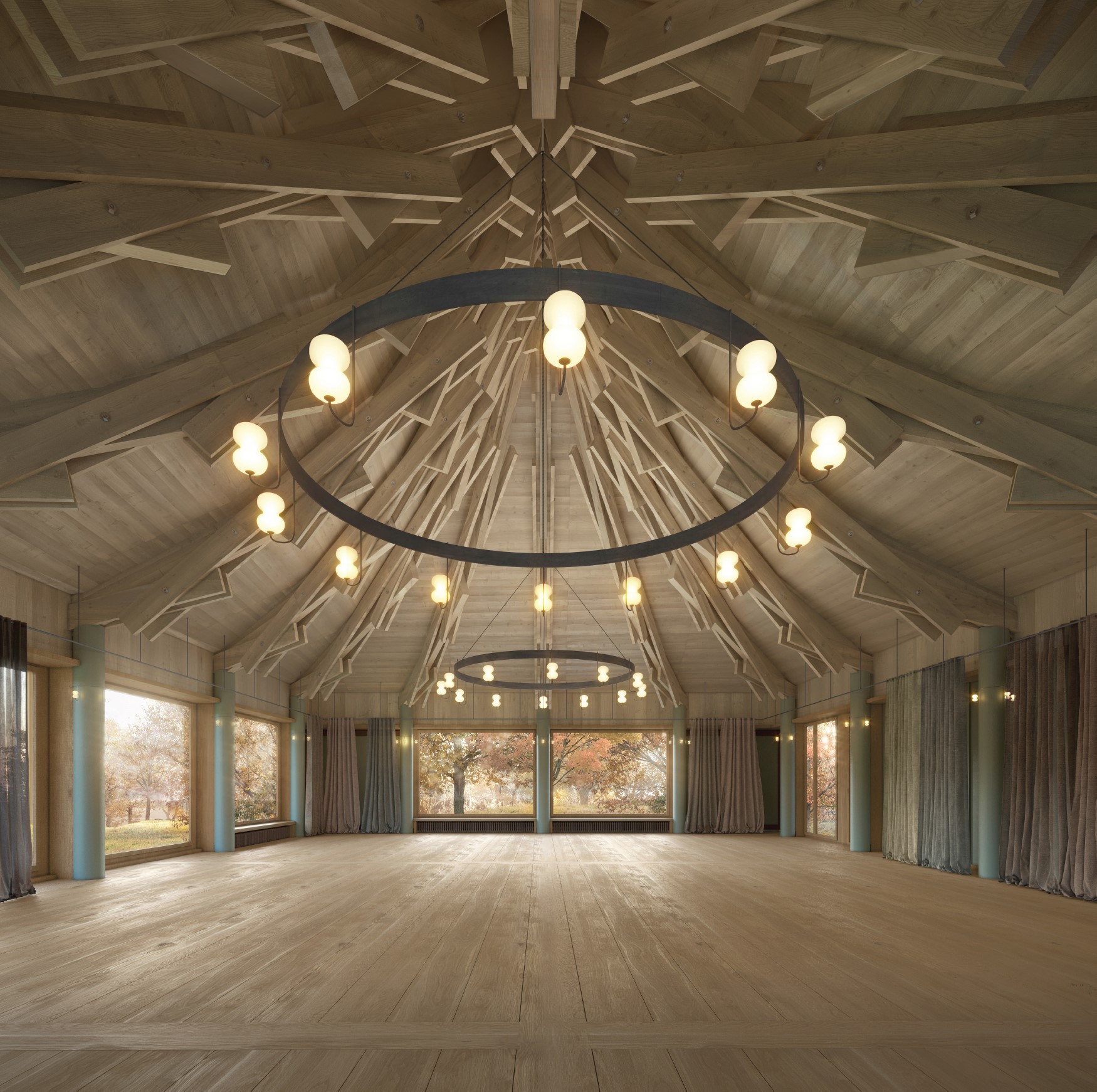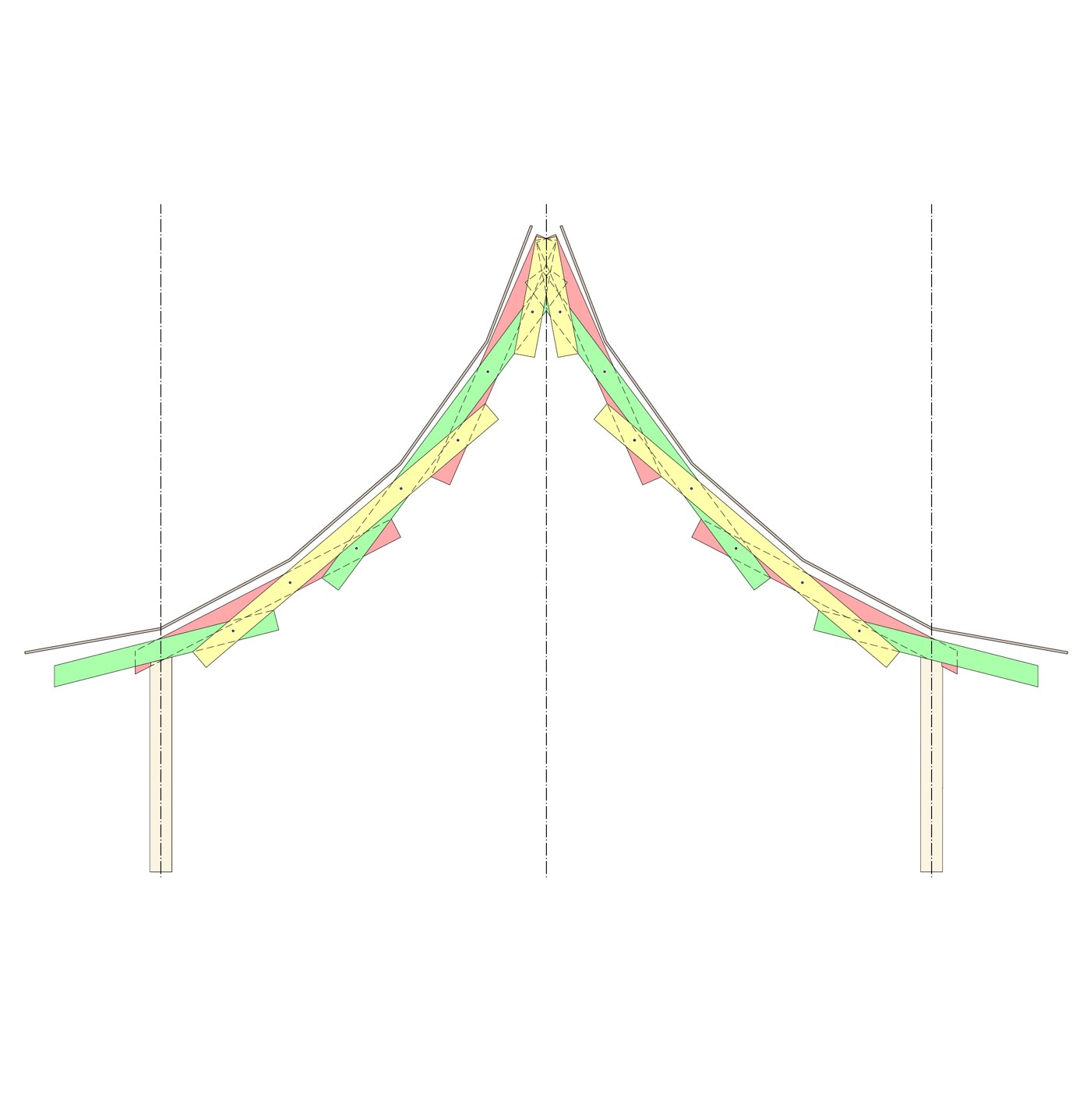 Der Saal wird stützenfrei ausgebildet. Durch die Wahl eines Hebelstabwerks für die Dachkonstruktion kann das Schnittholz aus dem Wald der Korporation mit minimaler Weiterbearbeitung verwendet werden. Jeweils 10 Stäbe werden mittels getrockneter Hartholzdübel so verbunden, dass ein biegesteifes Bauteil entsteht. Das Hebelstabwerk ist aussen durch die Dachform ablesbar, wird im Innern unverkleidet gezeigt und prägt so die festliche Atmosphäre des Saals.
