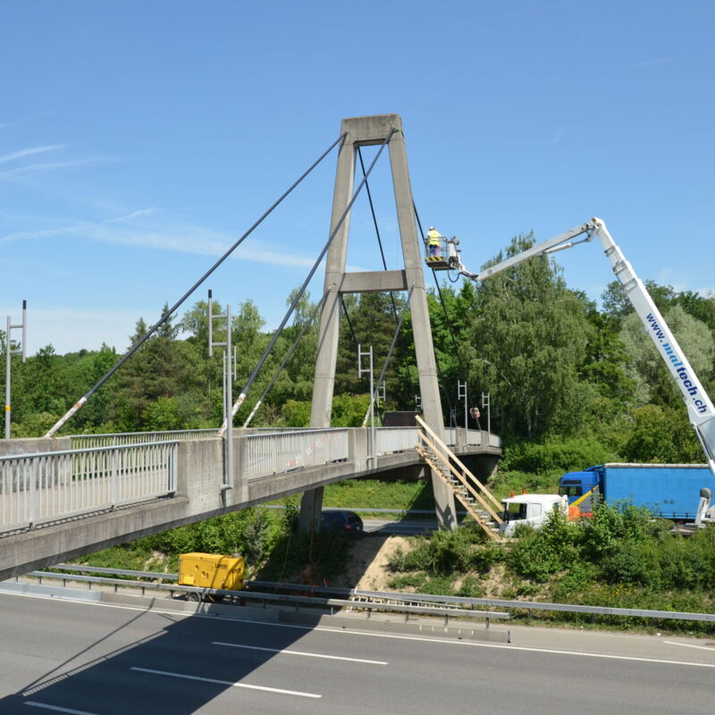 Die Personenüberführung Oberwies wurde einer vertieften Zustandsuntersuchung sowie einer detaillierten statischen Überprüfung unterzogen. Neben den Fragen der Anprall- und der Erdbebensicherheit lag hierbei ein besonderer Schwerpunkt auf der Beurteilung der Schrägkabel hinsichtlich Tragsicherheit, Dauerhaftigkeit und Ermüdung. Für die materialtechnologische Untersuchung der Schrägkabel und ihrer Verankerungen wurde daher ein umfassendes Untersuchungsprogramm u.a. bestehend aus magnetinduktiven Prüfungen sowie Sondageöffnungen an allen Kabeln durchgeführt.