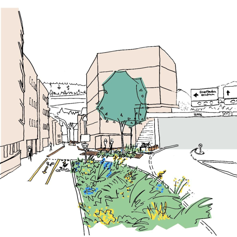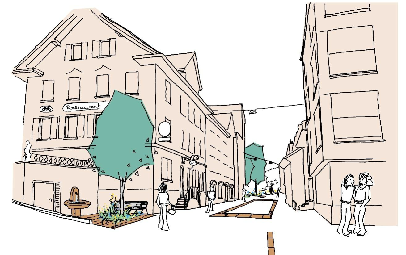 Die bestehende Gestaltung der Sonnenbergstrasse aus der Zeit als sie noch als Kantonstrasse fungierte, muss für die neuen Funktion als Begegnungszone, strassenbautechnisch neu gestaltet werden.