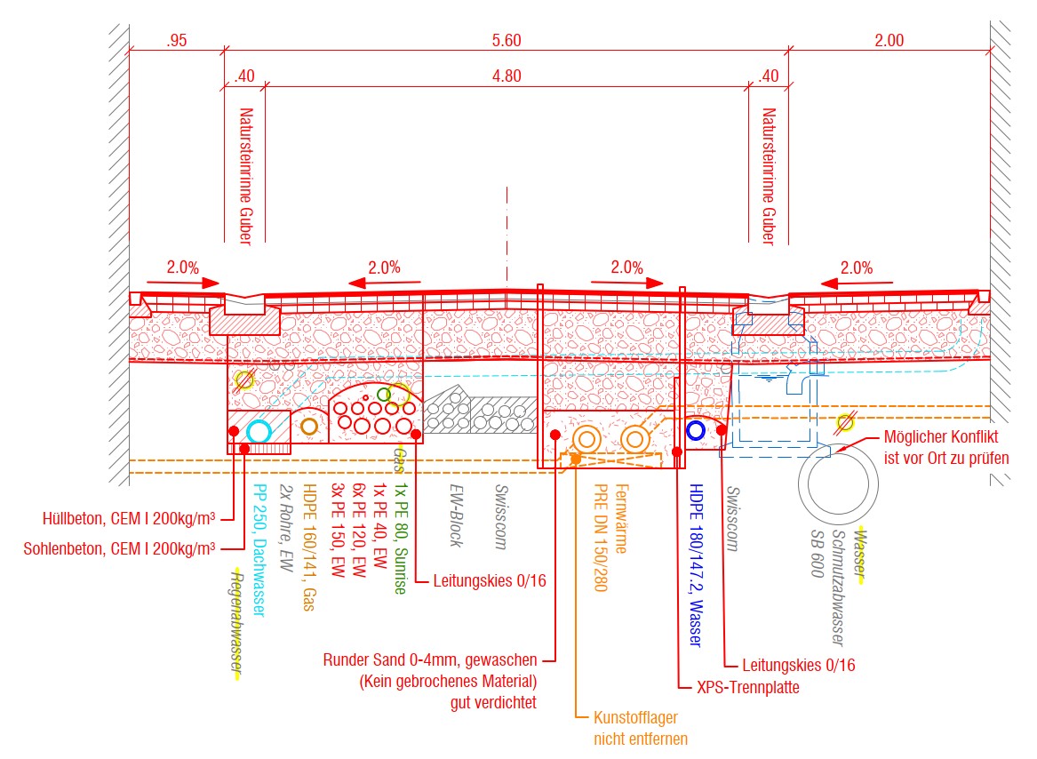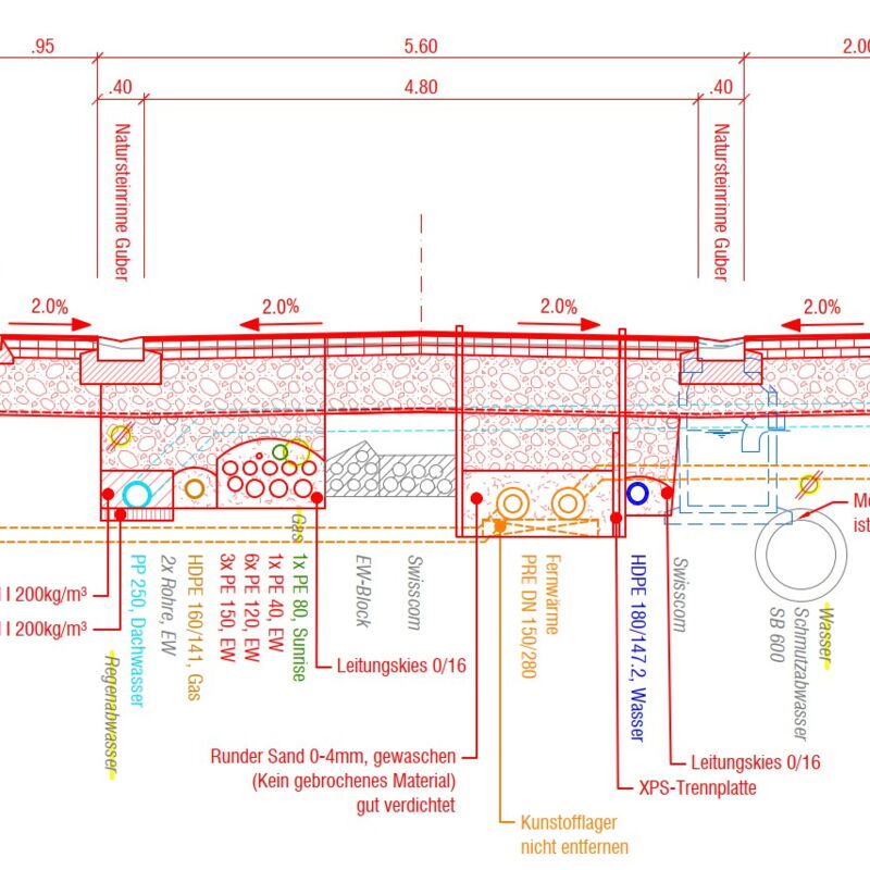 Ebenfalls koordiniert dsp Ingenieure + Planer AG sämtliche Werkleitungsprojekte in diesem Abschnitt sowie die Schnittstelle zu den unterschiedlichen Drittprojekten auf beiden Seiten des Projektabschnittes.
