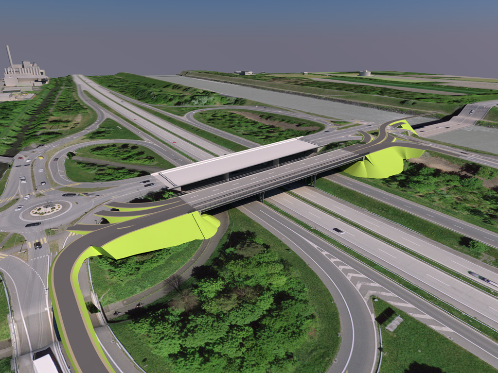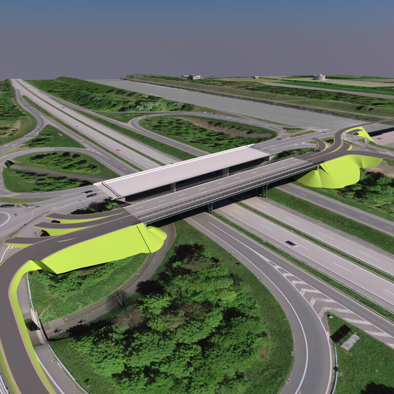 Die vierspurige Überführung Anschluss Buchs wird aufgrund bedeutender Schäden abgebrochen und durch einen Neubau ersetzt. Mit dem leicht verbreiterten Ersatzneubau wird der Veloverkehr optimiert, indem er künftig nicht mehr auf der Fahrbahn, sondern über kombinierte Rad-/ Gehwege an beiden Brückenrändern geführt wird. Die neue Brücke wird als integrale, dreifeldrige Plattenbalkenbrücke ohne Lager und Fahrbahnübergänge konzipiert, um den Unterhaltsaufwand langfristig zu minimieren. Das Bauwerk überspannt die N13 inklusive Ein- und Ausfahrtsrampen mit einer Gesamtlänge von 80m und einer Breite von 24.10m. Der Überbau besteht aus einem längs vorgespannten vierstegigen Ortbeton-Plattenbalken. Die bestehenden flach fundierten Stützen und Widerlager werden vollständig ersetzt und auf Grossbohrpfählen Ø 1.18 m fundiert, um den anspruchsvollen Baugrundverhältnissen und den bestehenden Setzungsproblemen Rechnung zu tragen. Aufgrund der grösseren Konstruktionshöhe des Neubaus werden die Ein- und Ausfahrtsrampen unterhalb der Brücke um bis zu 0.70m abgesenkt. Die Realisierung erfolgt unter Aufrechterhaltung des Verkehrs über eine Hilfsbrücke, welche während der Bauzeit drei Fahrspuren sowie einen Rad-/Gehweg trägt. Aufgrund der knappen Lichtraumverhältnisse und der anspruchsvollen geometrischen Verhältnisse in der Trassierung über die verschiedenen Verkehrsphasen wurde die gesamte Geometrie inkl. Trassierung und Bauhilfsmassnahmen vollständig in 3D geplant.
