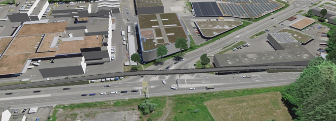 dsp wurde beauftragt, die Variante einer Velobrücke auf Machbarkeitsstufe so zu vertiefen, dass ein Variantenvergleich hinsichtlich Komforts, erforderlicher Anpassungen und Baumassnahmen, Kosten, Bauzeit sowie Bauen unter Betrieb möglich wird. Der bestehende Werkhof sowie die Ausnahmetransportroute bildeten dabei wesentliche Randbedingungen für die Entwicklung der horizontalen und vertikalen Linienbrückengeometrie.